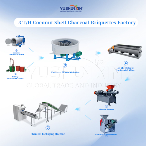 Producing 3 tons per hour of coconut shell charcoal briquettes requires a well-coordinated production line with specialized machinery at each stage. From crushing and milling to carbonization, mixing, briquetting, and drying, each machine plays a critical role in ensuring efficiency and quality. By investing in reliable and efficient equipment, producers can optimize production, reduce waste, and contribute to sustainable energy solutions, making coconut shell charcoal briquettes a viable alternative fuel source.